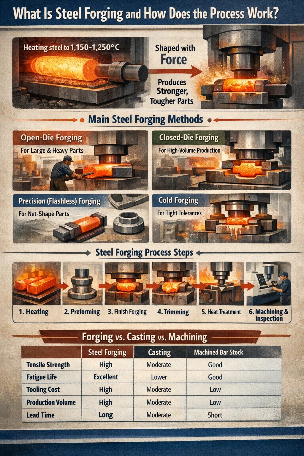 V jádru tohoto procesu je zahřátí oceli na určitý teplotní rozsah (obvykle mezi 1 100 °C a 1 250 °C pro uhlíkové a legované oceli) a následné použití síly k plastické deformaci materiálu do požadovaného tvaru. Zvýšená teplota snižuje tokové napětí a zlepšuje tažnost, takže se kov snadněji tvaruje bez praskání. Po ochlazení je kovaná část podrobena následnému tepelnému zpracování, obrábění a kontrole před odesláním.