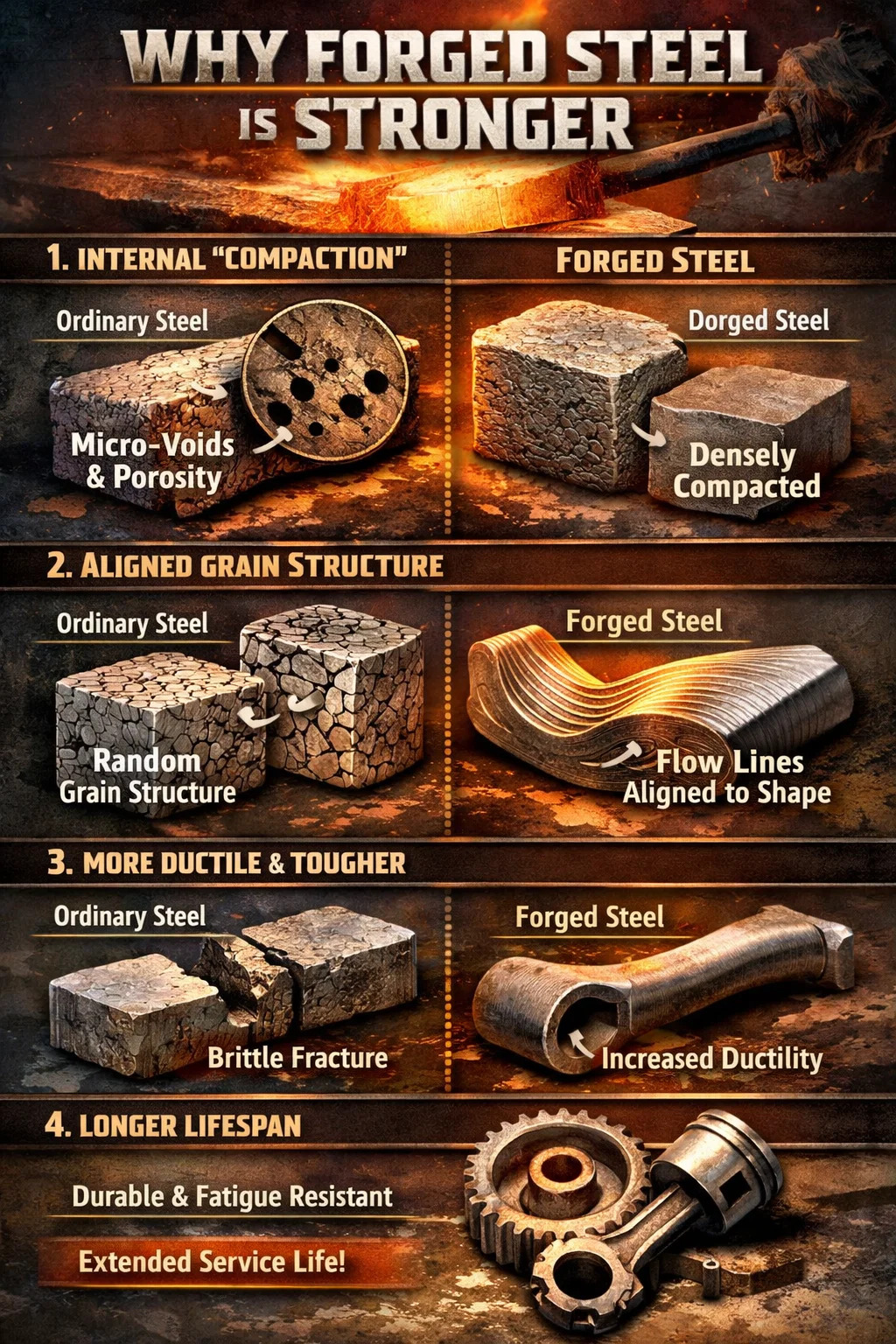 Kovaná ocel: Pod obrovským tlakem jsou tyto malé póry zcela zploštěny a svařeny dohromady, takže celý kus kovu je hustý jako pevný blok. Bez vnitřních vad je díl přirozeně pevnější.