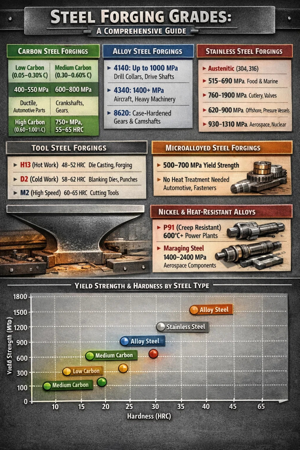 Ocelové kování je jedním z nejstarších a nejspolehlivějších kovoobráběcích procesů ve výrobě. Krátká odpověď na to, jaké druhy kovací oceli existují: uhlíková ocel, legovaná ocel, nerezová ocel, nástrojová ocel a mikrolegovaná ocel je pět základních kategorií používaných v průmyslovém kování oceli. Každý typ splňuje odlišné mechanické a ekologické požadavky a výběr špatného typu může vést k předčasnému selhání, bezpečnostním rizikům nebo zbytečnému překročení nákladů.