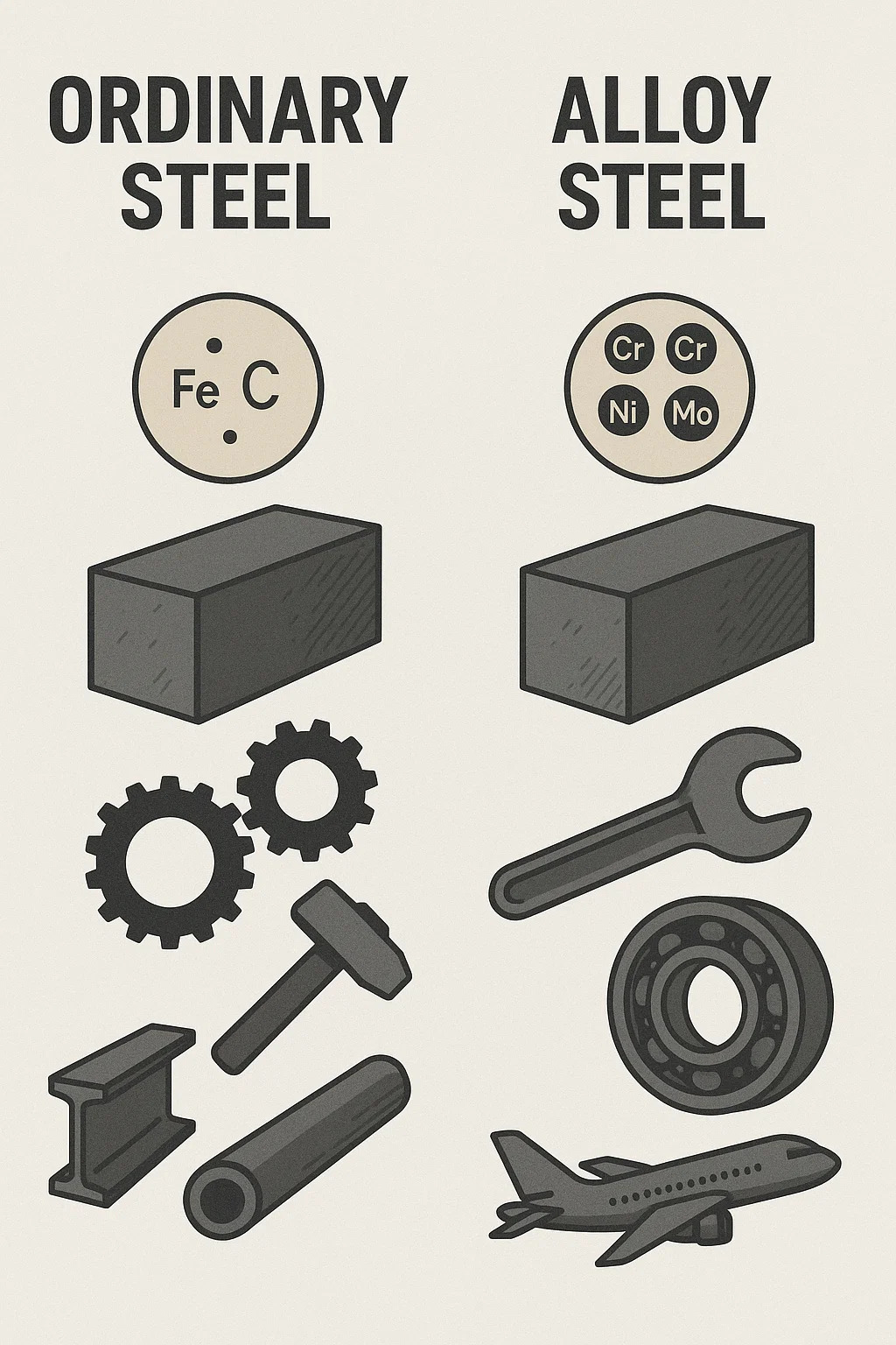 | Funkce | Uhlíková ocel (obyčejná ocel) | Legovaná ocel |