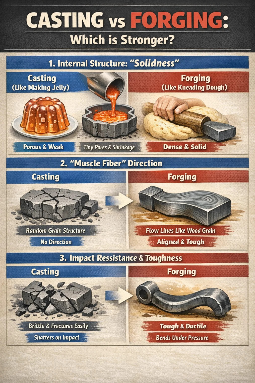 Porovnáme-li kov s přísadami potravin, lití je jako „vyroba želé“. ocelové kování je jako "hnětení těsta." Obojí sice dokáže vytvořit požadovaný tvar, ale vnitřní hustota a odolnost proti nárazu jsou zcela odlišné.
