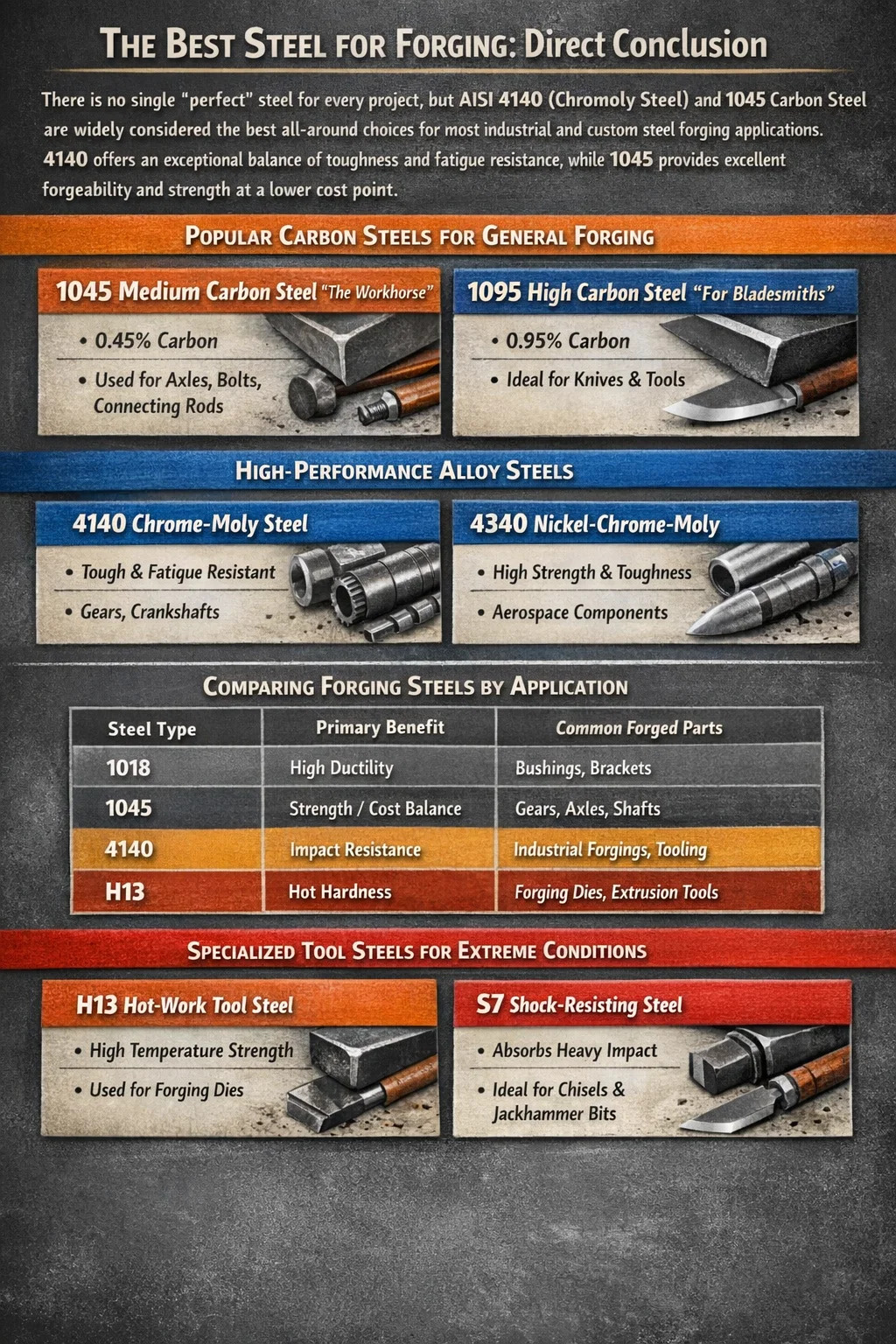 Pro každý projekt neexistuje jediná „dokonalá“ ocel, ale AISI 4140 (Chromoly Steel) a 1045 uhlíková ocel jsou široce považovány za nejlepší všestranné volby pro většinu průmyslových a zakázkových ocelové kování aplikací. 4140 nabízí výjimečnou rovnováhu houževnatosti a odolnosti proti únavě, zatímco 1045 poskytuje vynikající kujnost a pevnost za nižší cenu.