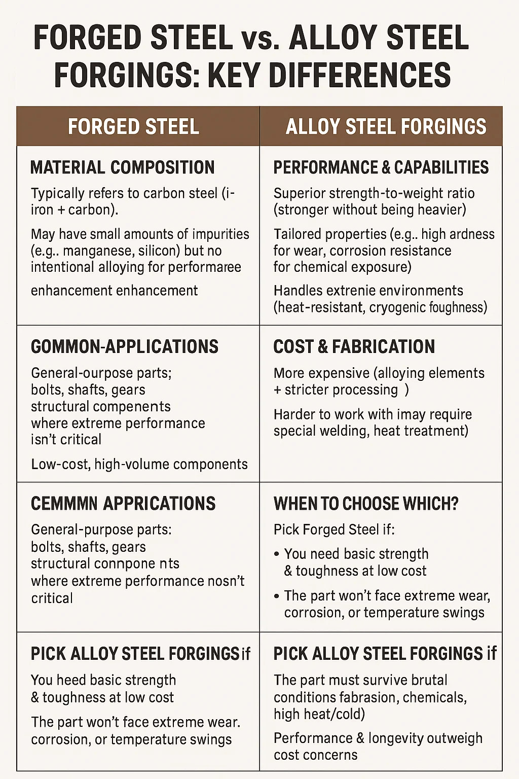 Forged Steel: Obvykle odkazuje na uhlíkovou ocel (železný uhlík). Může mít malá množství nečistot (např. Manganu, křemík), ale žádné úmyslné zmocnění pro zvýšení výkonu.