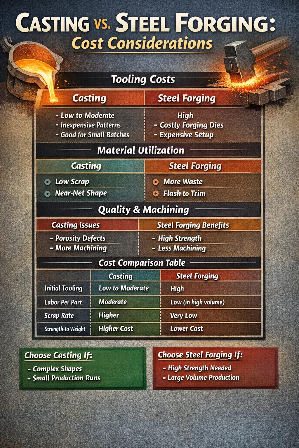 Krátkodobě a pro jednoduchou, velkosériovou výrobu složitých tvarů, odlévání je obecně levnější ohledně počáteční jednotkové ceny. Nicméně, ocelové kování často se z dlouhodobého hlediska ukazuje jako ekonomičtější u dílů, které vyžadují vysokou pevnost, minimální vady a dlouhou životnost. "Nejlevnější" možnost závisí zcela na objem výroby, složitost geometrie a požadavky na sekundární obrábění.